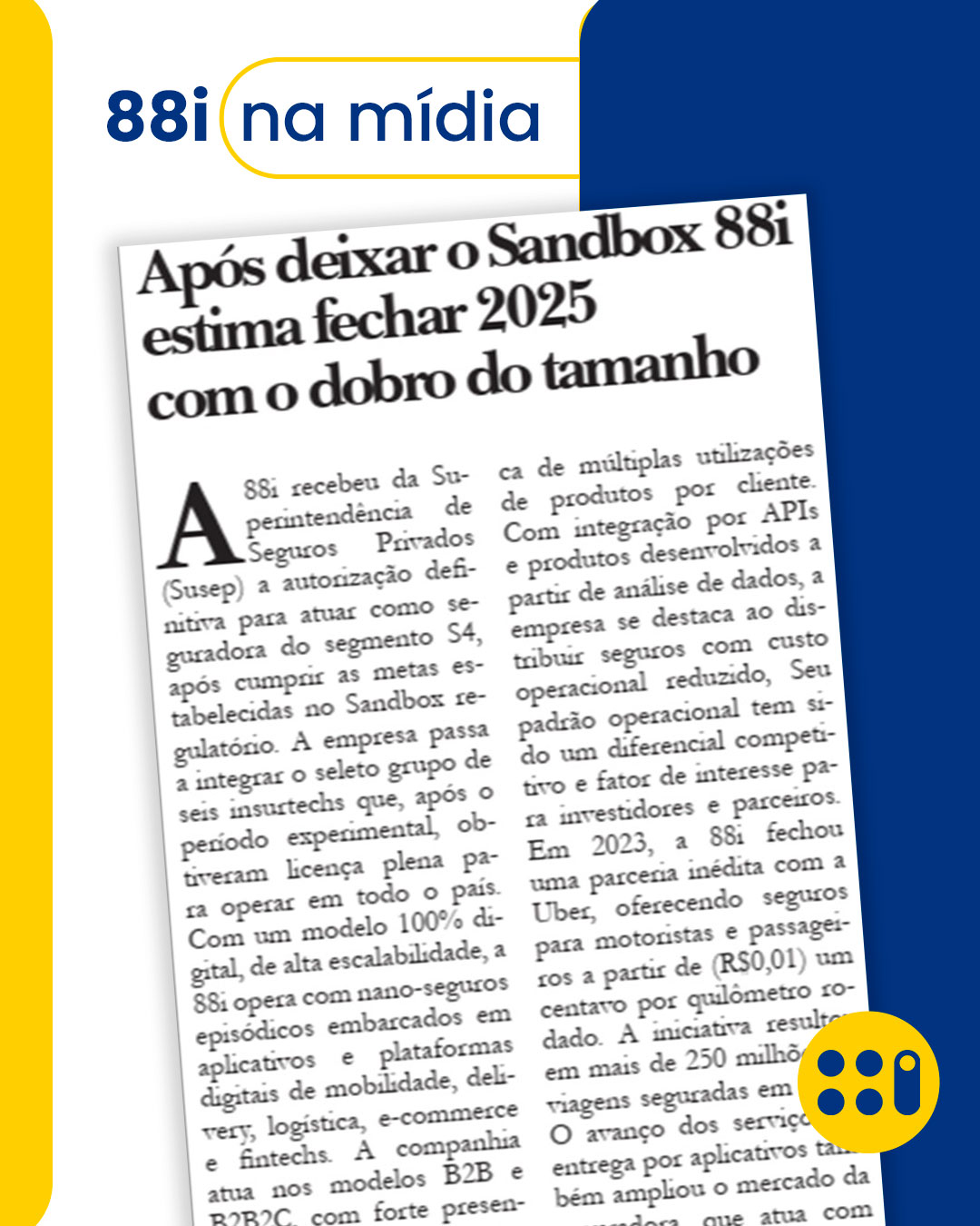 A 88i recebeu da Superintendência de Seguros Privados (Susep) a autorização definitiva para atuar como seguradora do segmento S4, após cumprir as metas estabelecidas no Sandbox regulatório. A empresa passa a integrar o seleto grupo de seis insurtechs que, após o período experimental, obtiveram licença plena para operar em todo o país.